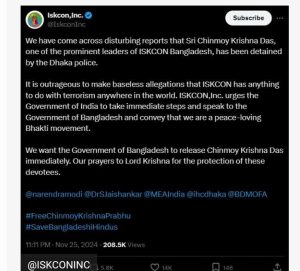 গতকাল তাদের অফিশিয়াল এক্স (পূর্বের টুইটার) হ্যান্ডেলে টুইট করে জানিয়েছে, সন্ত্রাসবাদের সাথে ইসকনের যুক্ত থাকার অভিযোগ ভিত্তিহীন এবং অত্যন্ত আপত্তিজনক।
