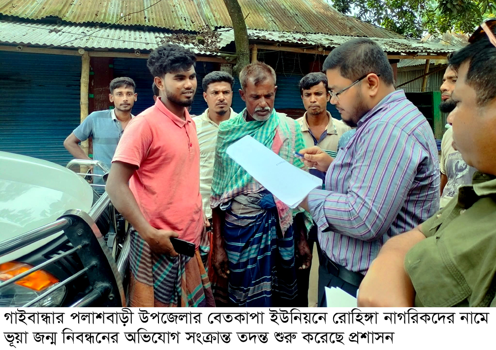 গাইবান্ধার পলাশবাড়ী উপজেলার বেতকাপা ইউনিয়নে রোহিঙ্গা নাগরিকদের নামে ভূয়া জন্ম নিবন্ধনের অভিযোগ সংক্রান্ত তদন্ত শুরু করেছেন স্থায়ীয় প্রশাসন। স্থানীয় সূত্রে