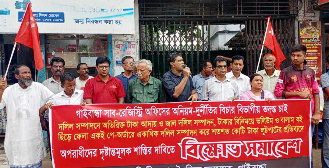 গাইবান্ধা সদর উপজেলা সাব-রেজিস্ট্রি অফিসের অনিয়ম-দুর্নীতির বিচার বিভাগীয় তদন্তসহ অপরাধীদের দৃষ্টান্তমূলক শাস্তি দাবিতে মঙ্গলবার দুপুরে শহরের ডিবি রোড গানাসাস