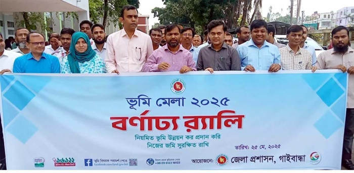 নিয়মিত ভূমি উন্নয়ন কর প্রদান করি নিজের জমি সুরক্ষিত রাখি’ এই স্লোগান নিয়ে গাইবান্ধায় তিন দিনব্যাপী ভূমি মেলা শুরু হয়েছে।
