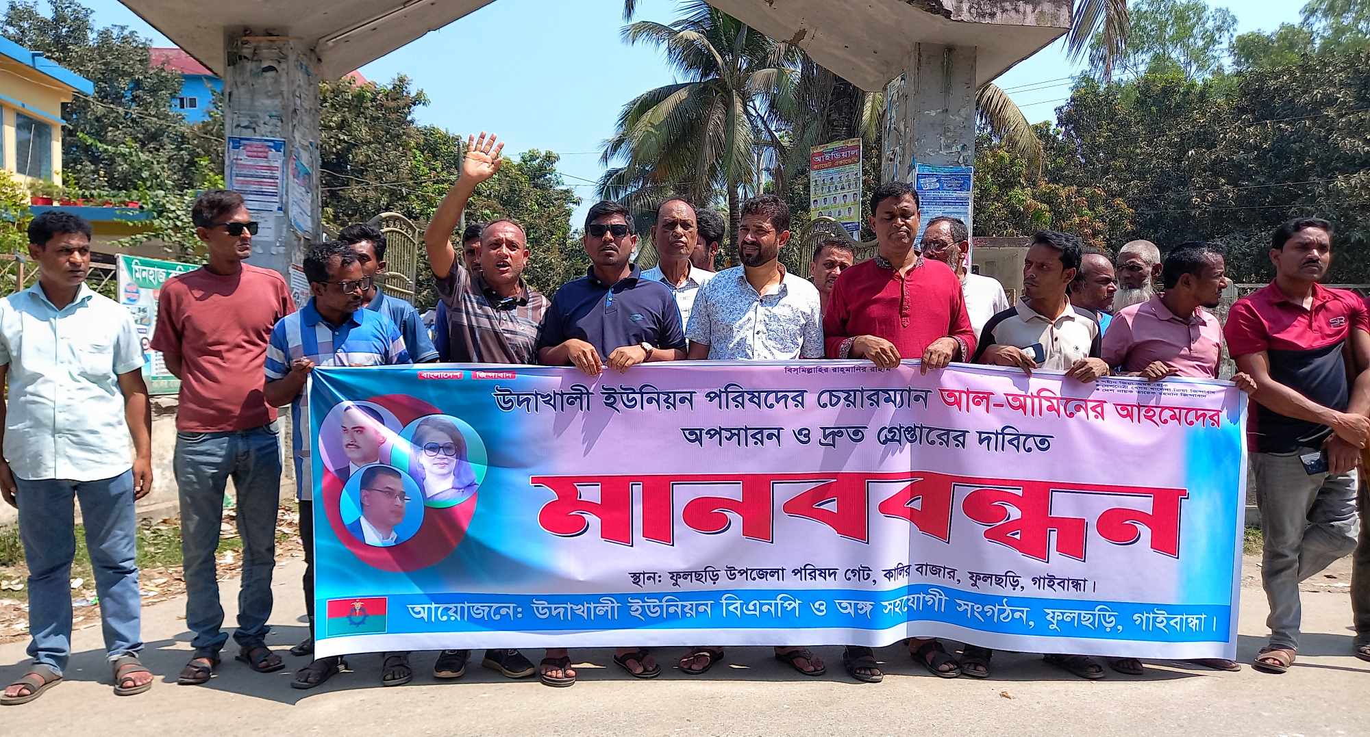 ফুলছড়ি (গাইবান্ধা) প্রতিনিধি: গাইবান্ধার ফুলছড়ি উপজেলার উদাখালী ইউনিয়ন পরিষদের চেয়ারম্যান আল-আমিন আহমেদের অপসারণ ও গ্রেপ্তারের দাবীতে মানববন্ধন করেছে বিএনপির